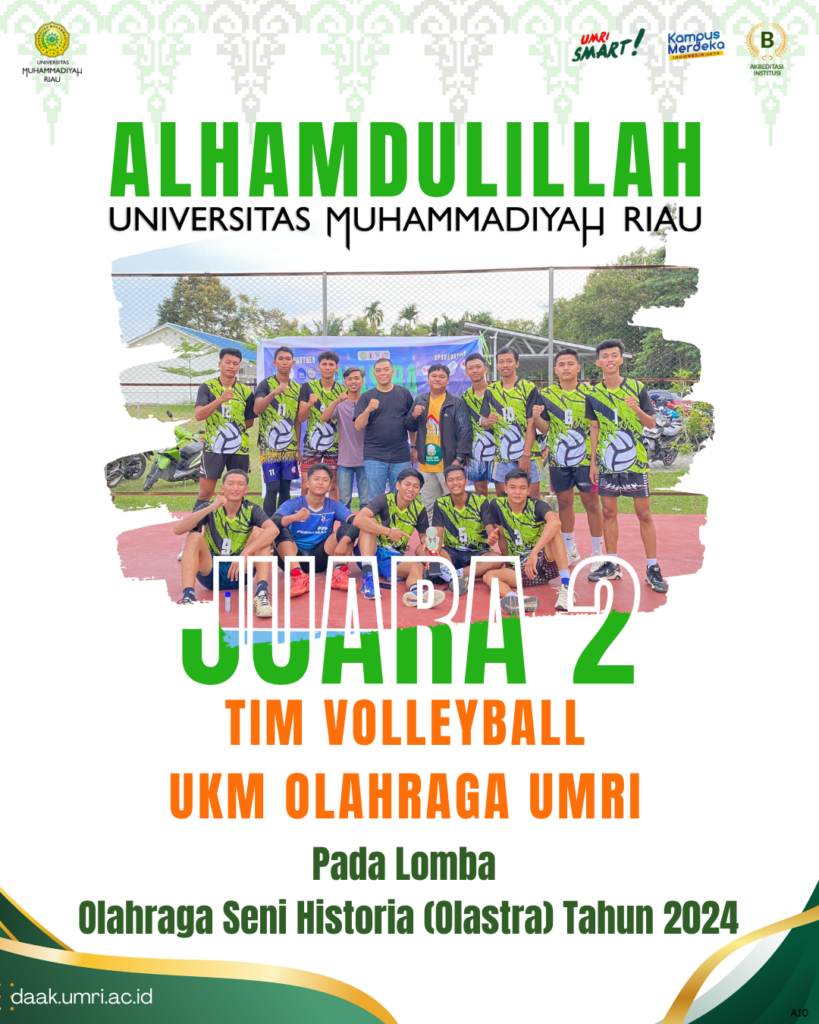 Tim Volleyball UKM Olahraga UMRI berhasil meraih Juara 2 pada Olahraga Seni Historia (Olastra) Tahun 2024. Keberhasilan ini menambah prestasi Universitas Muhammadiyah Riau di bidang olahraga.